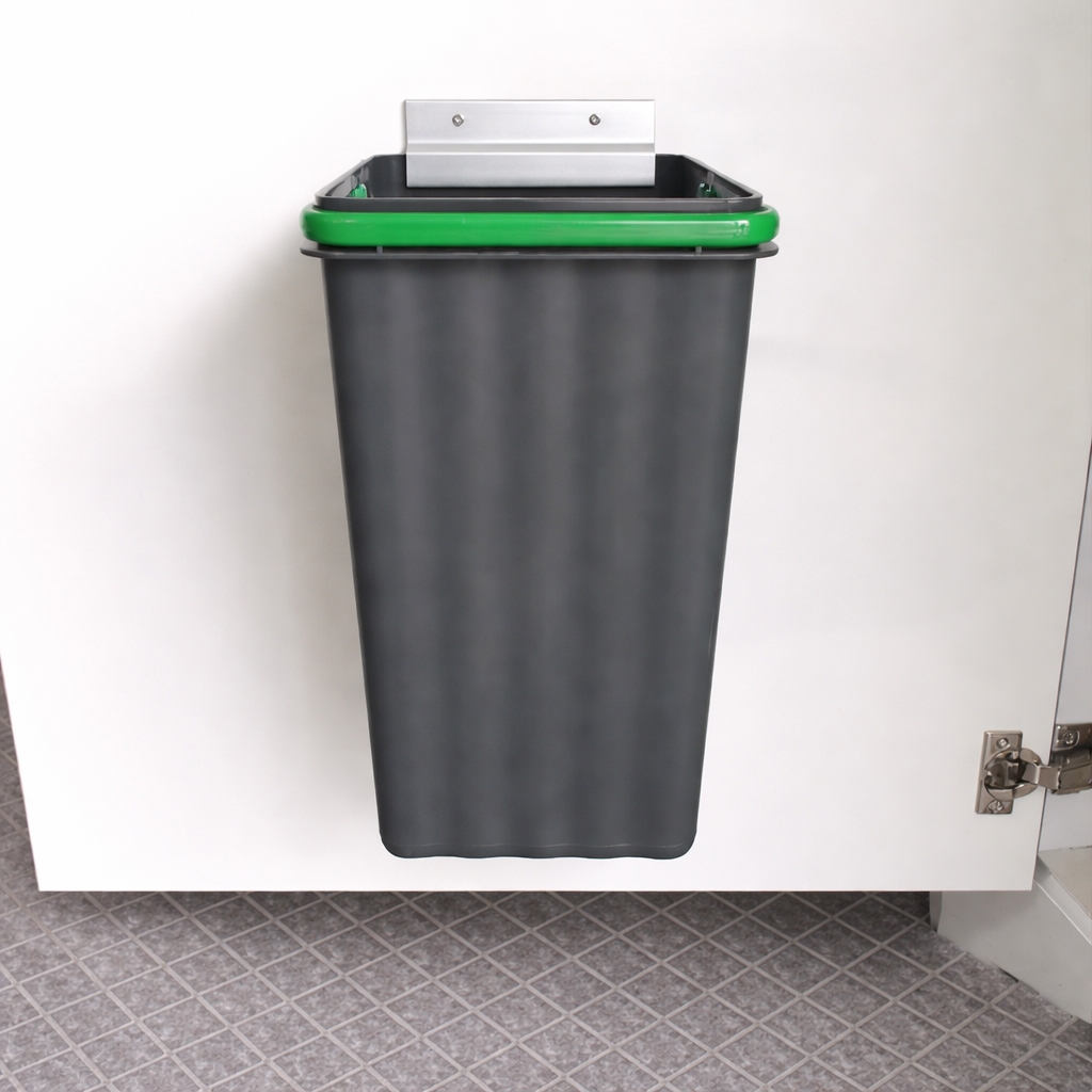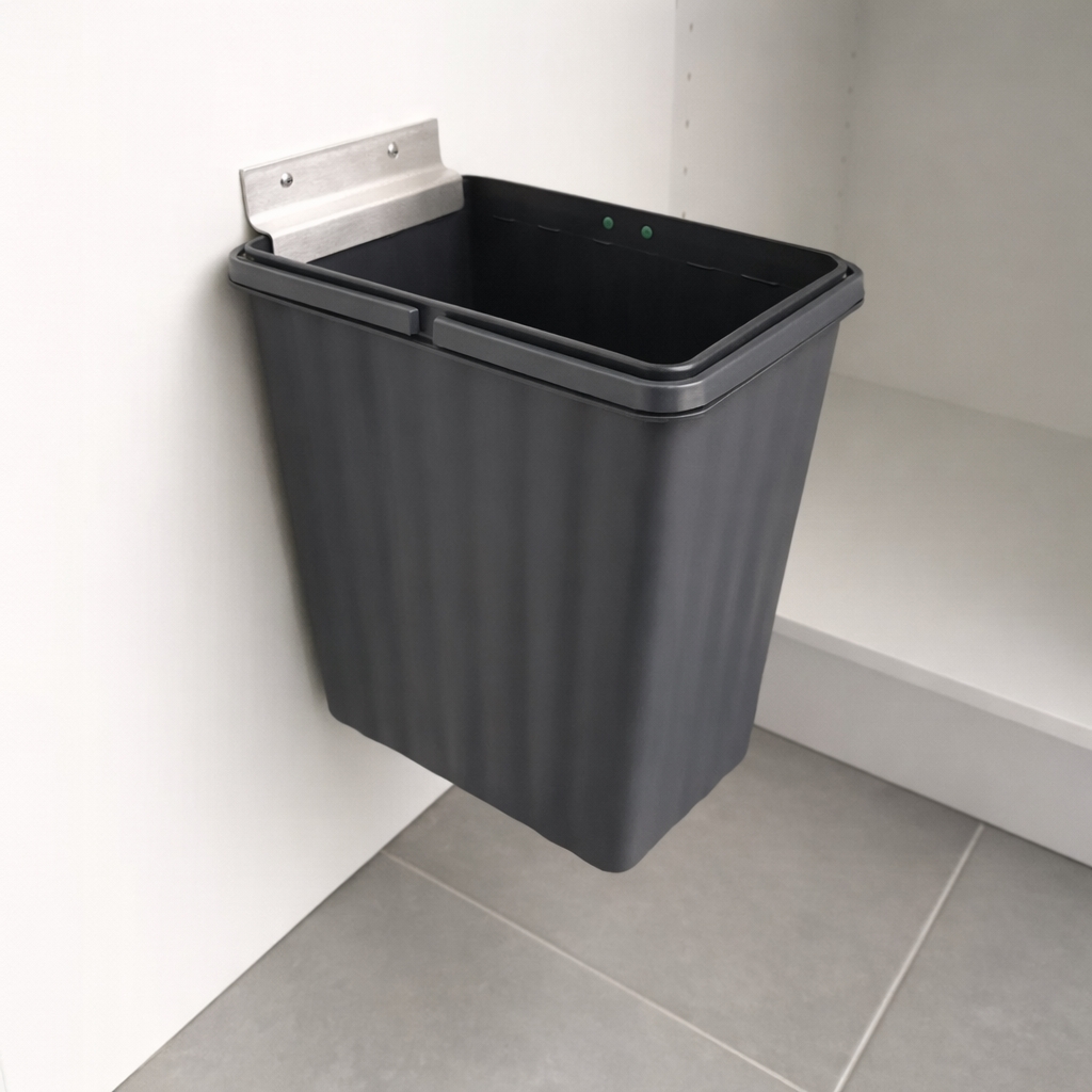 En 7,5 liters Mørkegrå affaldsspand monteres på den smalle side, hvilket gør den ideel til mindre køkkenskabe eller som ekstra sorteringsspand ved siden af affaldssystemet. Den fylder mindre i bredde og dybde end større modeller og er derfor særligt velegnet, hvor pladsen er begrænset f.eks. under vasken hvor det kan være svært at placere en skraldespand på grund af rørføringer.