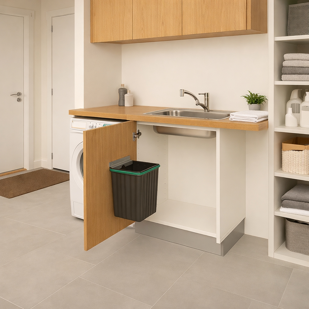 Affaldsspanden kan også anvendes i bryggers, bad eller værksted, hvor der er behov for en fleksibel og pladsbesparende affaldsløsning.