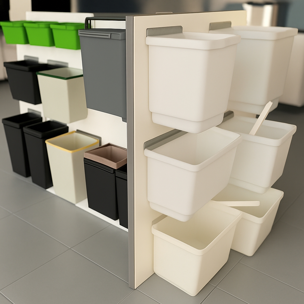 Er populær til affaldssortering i 60 cm skabe hvor der ofte monteres to eller flere skraldespande side om side, afhængigt af plads til vask og rørføring. Det giver en enkel og overskuelig løsning til affaldssortering i køkkenskabet.