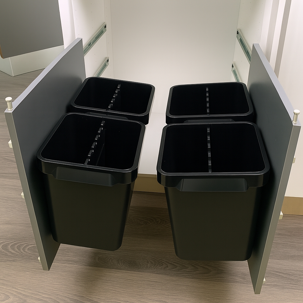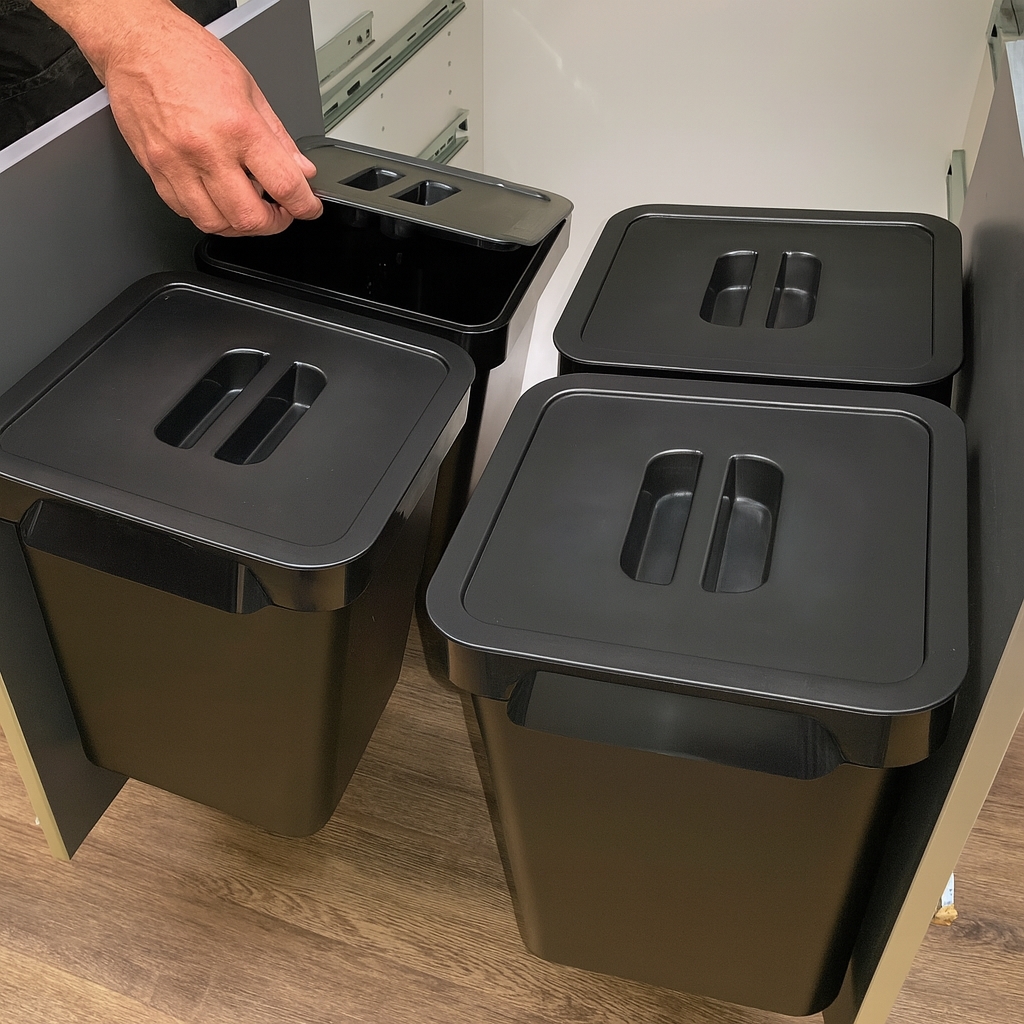Du kan bygge et affaldssorteringssystem, der passer præcist til din skabsbredde, dit behov for sortering og din indretning.