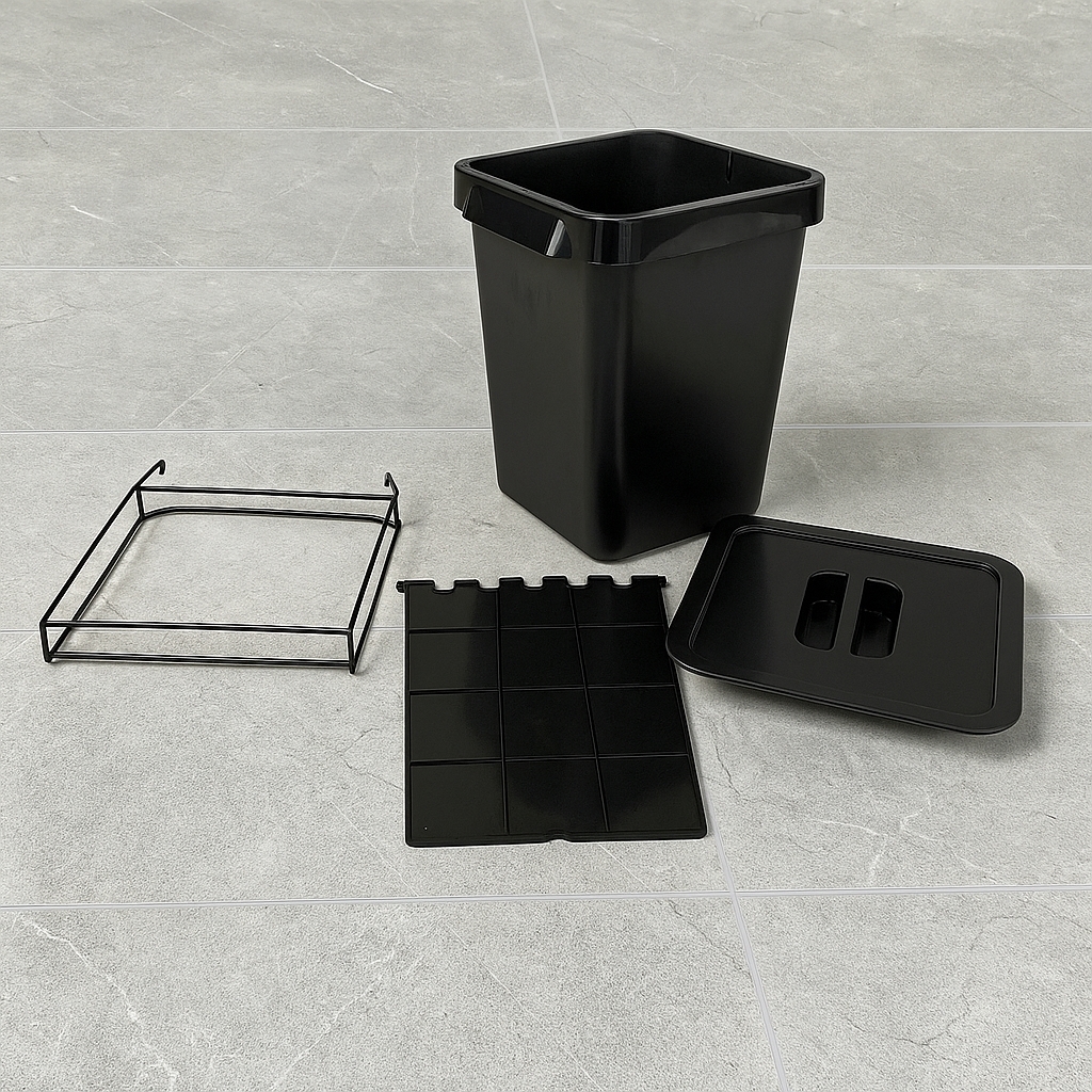 Systemet består af 2 Skanitek Sorti affaldsspande på hver 11L, som hænges op på en basisplade med udtræk – så du nemt kan trække spandene ud og smide affald i. Det er nemt at tage spandene af og på, når de skal tømmes og ved rengøring.