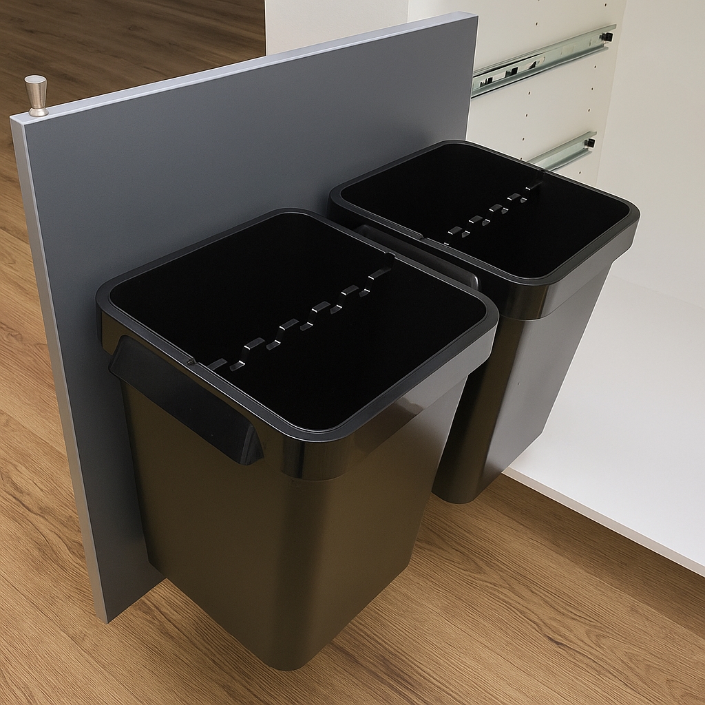 Har du brug for flere affaldsspande, kan du nemt opgradere med ekstra Skanitek Sorti affaldsspande eller bygge dit eget affaldssystem efter mål under vasken – tilpasset plads og med mulighed for at tilføje flere spande.