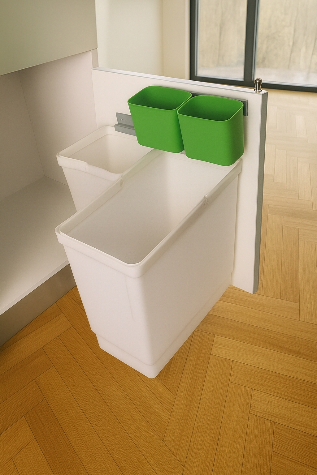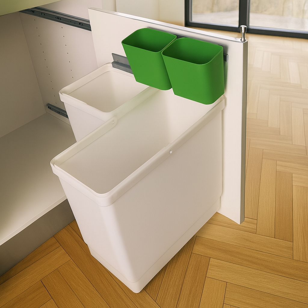 Du kan bygge et affaldssorteringssystem, der passer præcist til din skabsbredde, dit behov for sortering og din indretning.