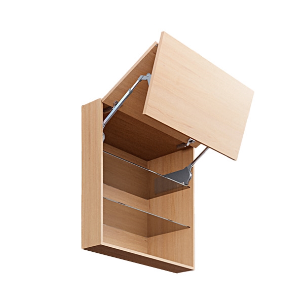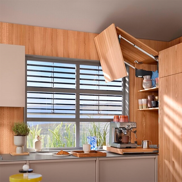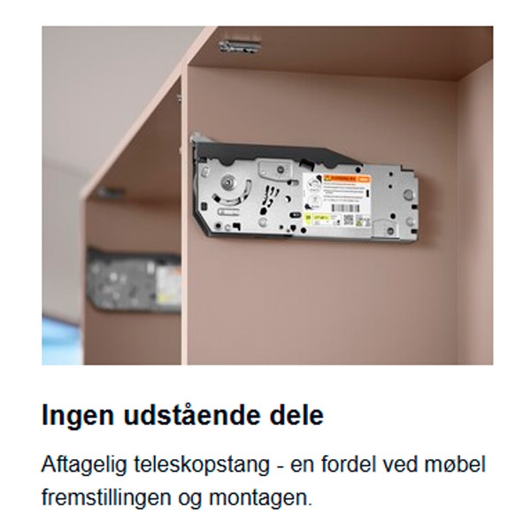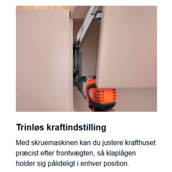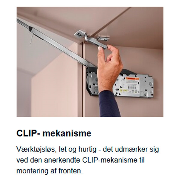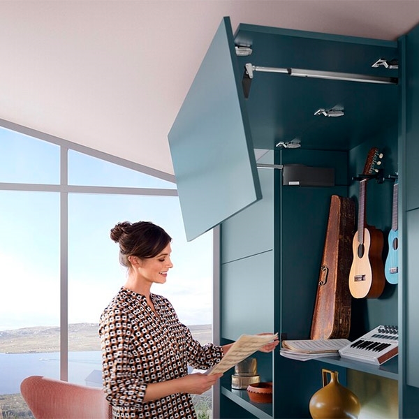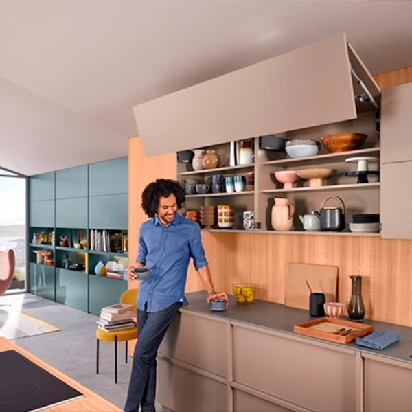 Aventos HF TOP er til dig med et ekstra højt overskab, som kræver to-delte låger/fronter. De glider op og står stille i den højde, du placerer dem i.
