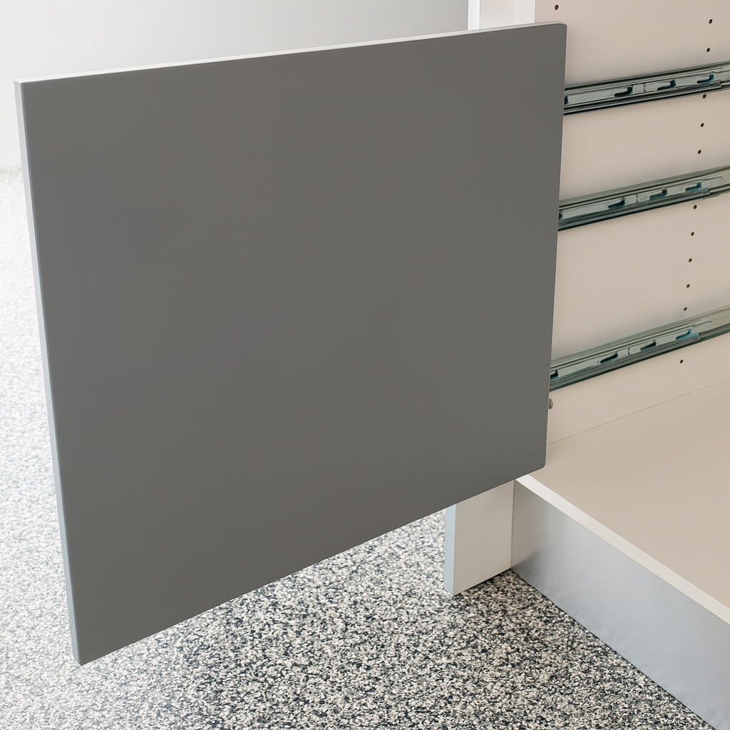 "Byg selv systemet" basis udtræk består her af en grå udtræksplade med ABS kanter af alu-look. Desuden har pladen tandem skuffeskinner med kugleløb, som glider nemt, samt et lille greb som er nemt at nå. Du kan så montere spande du selv vælger, på udtrækspladen: