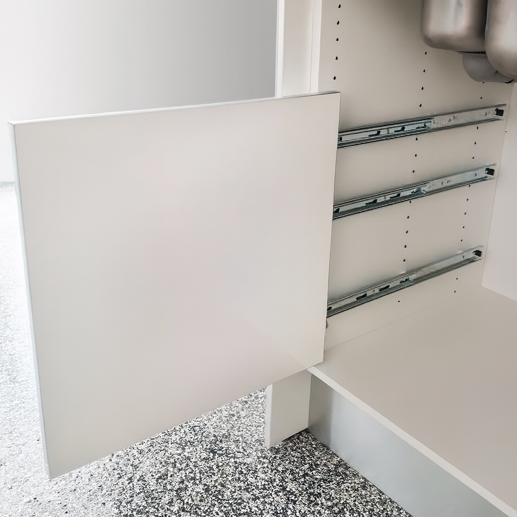 - Du kan lave en meget smal / dyb løsning, en meget bred løsning eller en L-formet løsning med en smal spand inderst og en bred spand yderst, f.eks. for at undgå afløbsrør i skabet