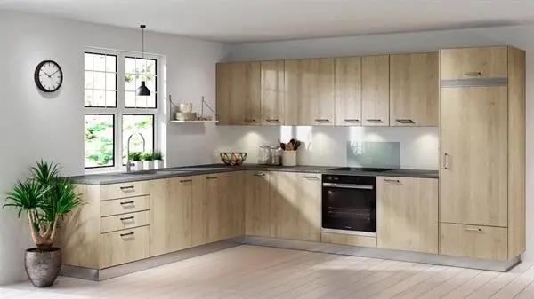 Livø-lågen har en farve af natur eg - en behagelig, afdæmpet nordisk farve. Den har træstruktur som kan mærkes med fingrene og er vedligeholdelsesfri og slidstærk. Med f.eks. en bordplade i samme farve og ingen overskabe, får du et meget minimalistisk og populært, stilrent køkken.