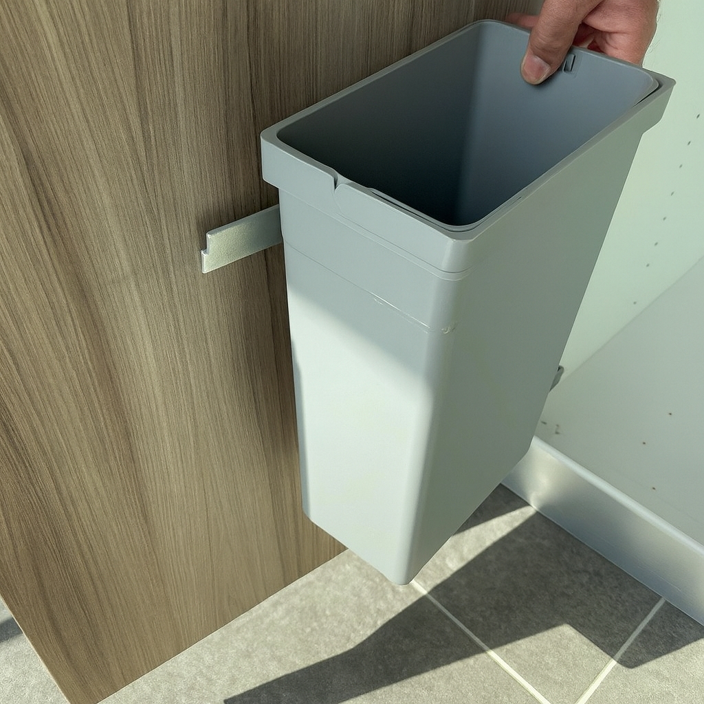 Med beslaget kan du herefter placere din spand/spande, hvor du ønsker i fx. skab, på låge, på væg eller på vores individuelle udtræksplade.