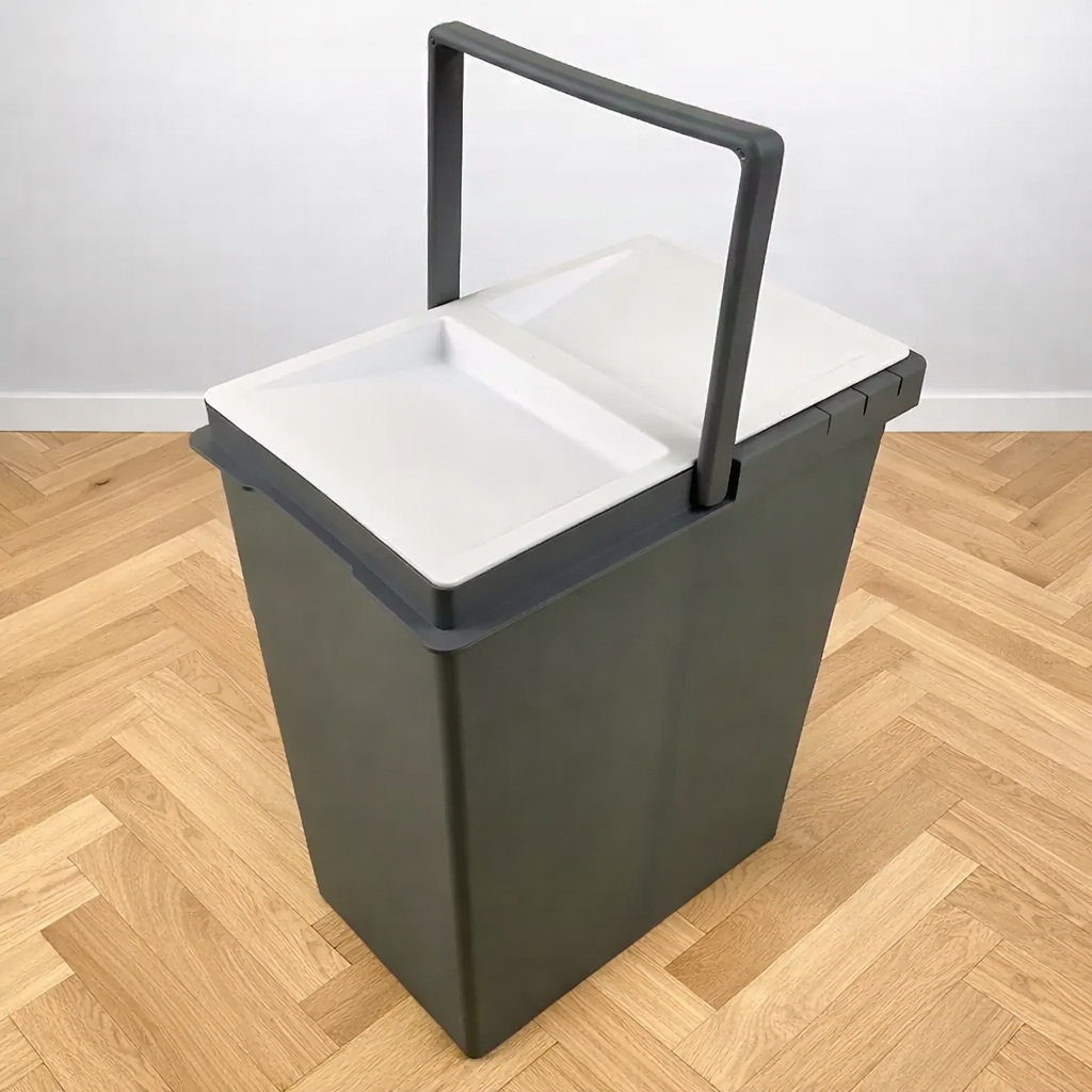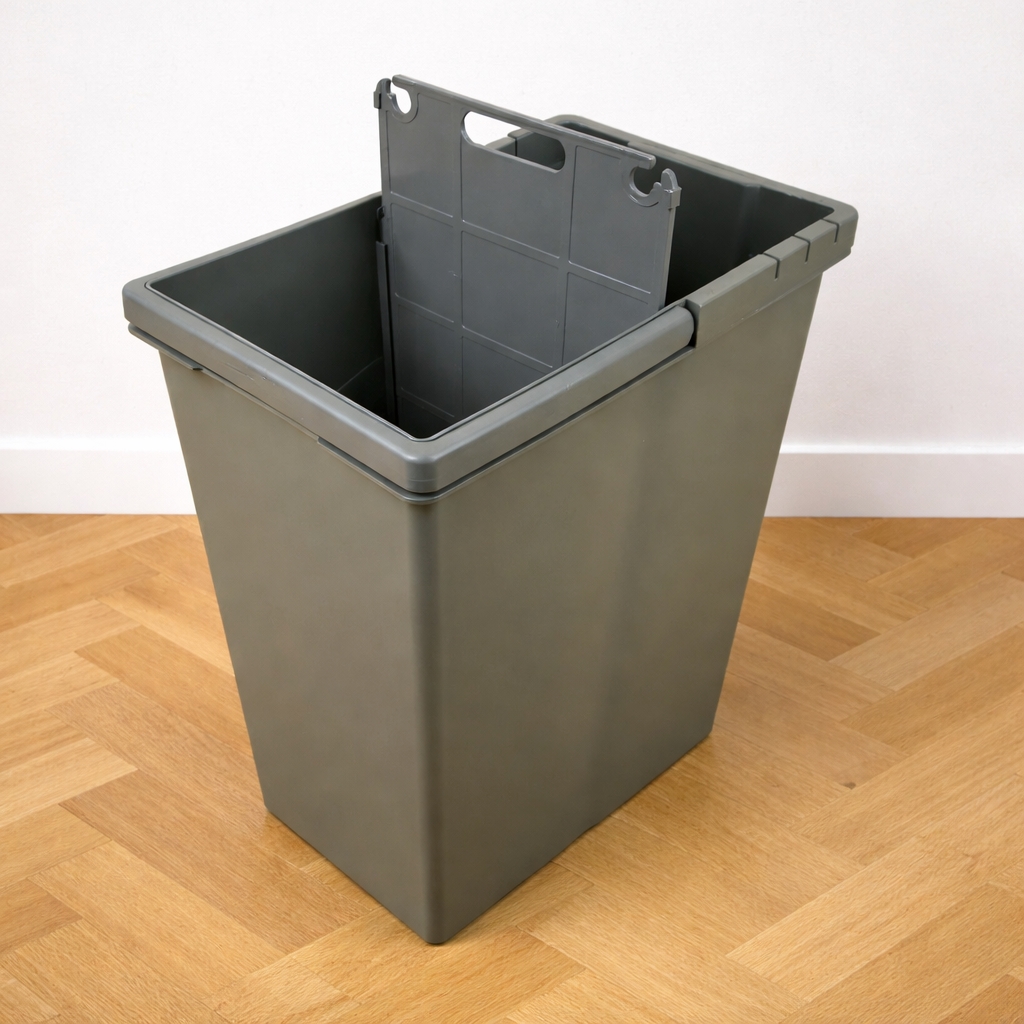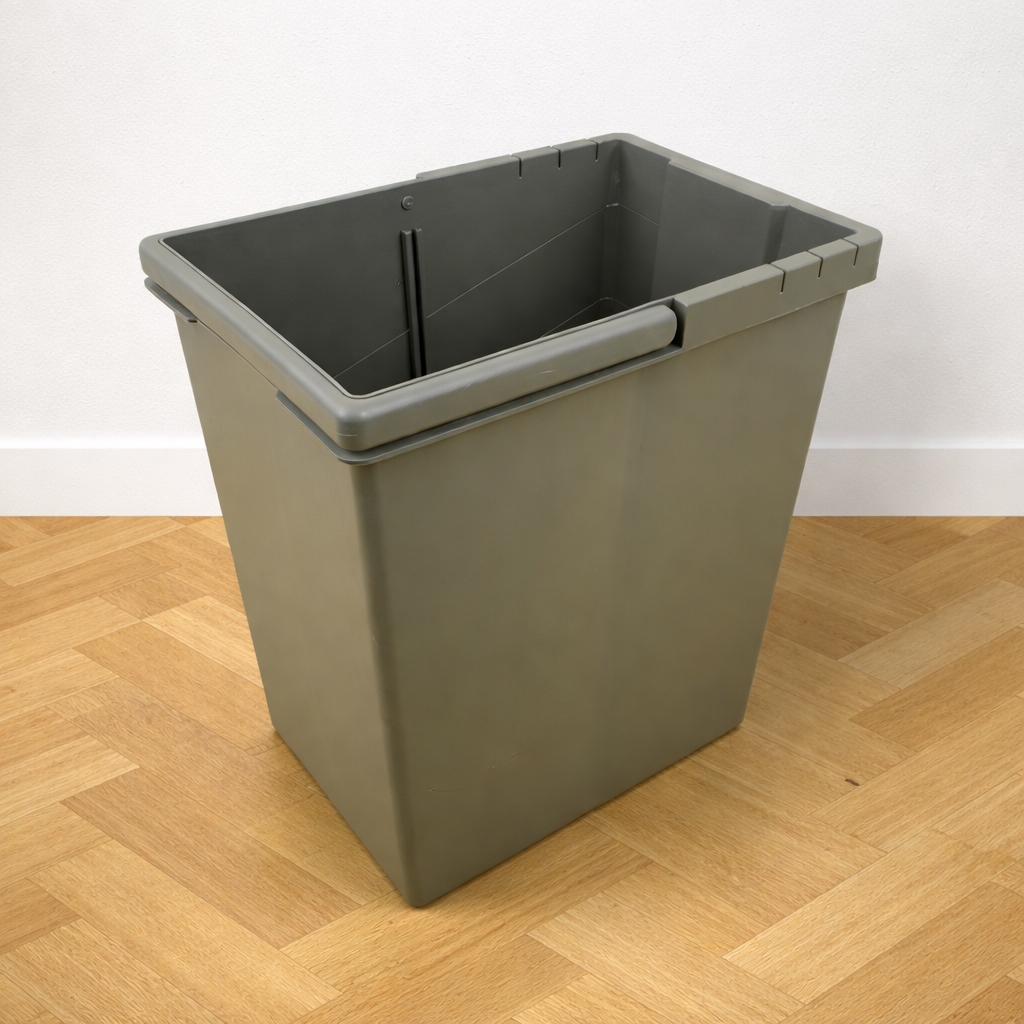 Denne grå skraldespand til sortering på 14 liter er i en kraftig kvalitet og passer perfekt under vasken. Skraldespanden er med hank og der medfølger ophængsbeslag så den er klar til montering på indersiden af køkkenlågen eller direkte i køkkenskabet.