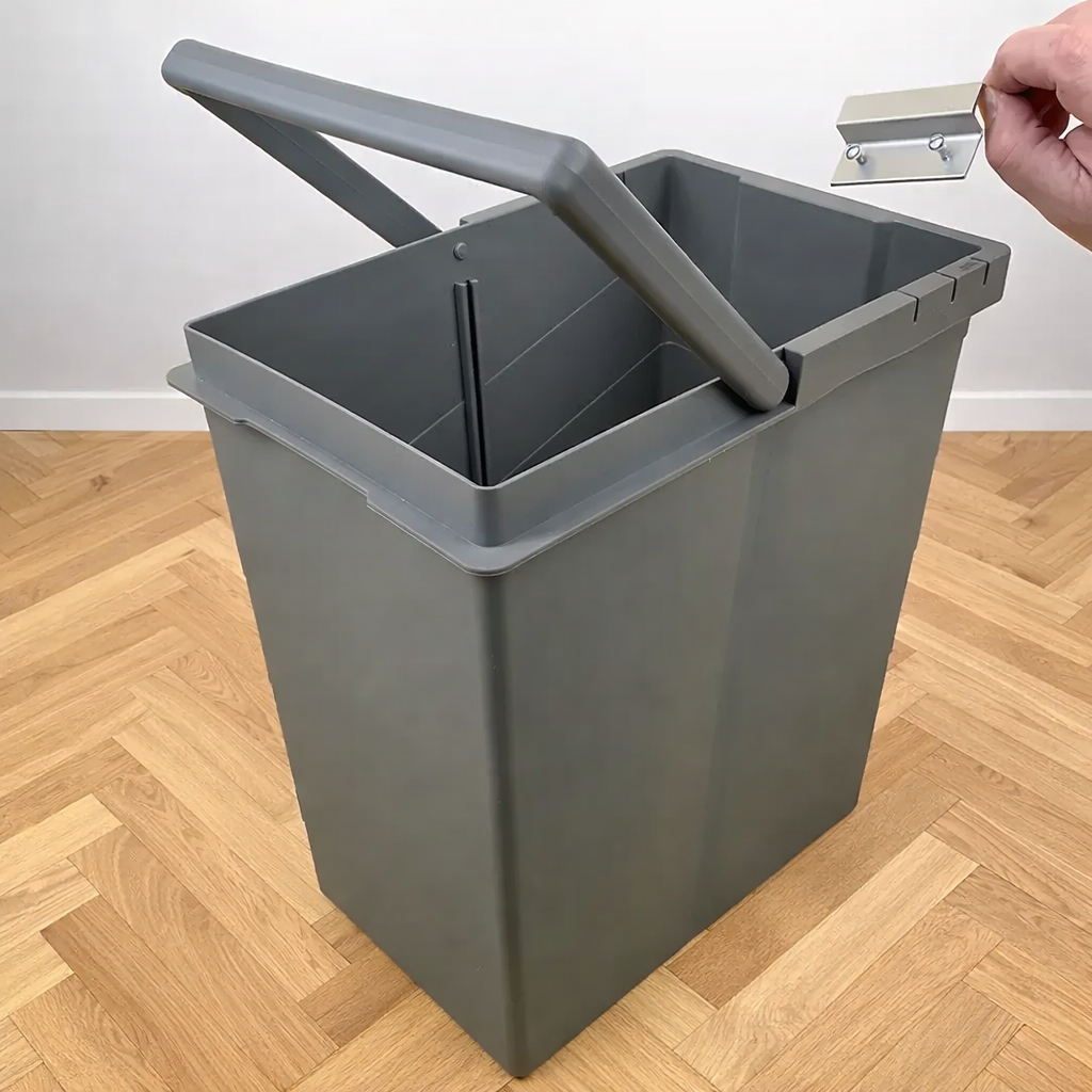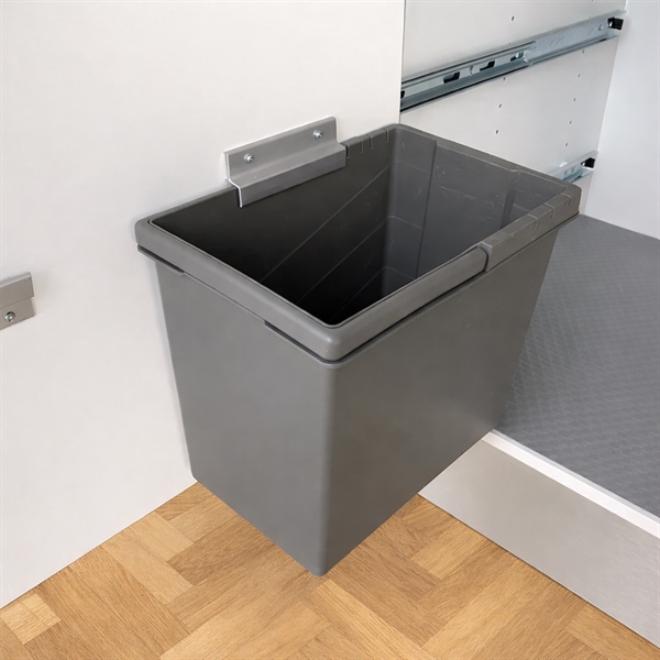 Denne grå 11 liters skraldespand er beregnet til bred montering og monteres på den brede side af spanden. Det er en stabil og robust ophængsløsning på køkkenlågen. Der medfølger beslag, så den er klar til montering på indersiden af køkkenlågen, på en udtræksplade eller direkte i køkkenskabet.