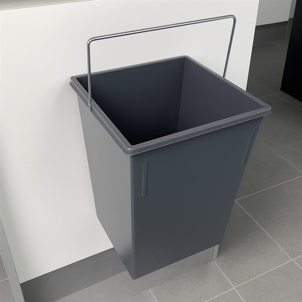 Denne grå affaldsspand til køkkenskab på 15 liter fra Hailo, er i en kraftig kvalitet med hank og er en pladsbesparende løsning til affaldssortering i køkkenet. Affaldsspanden leveres med ophængsbeslag og er velegnet til montering på indersiden af køkkenlågen eller direkte i køkkenskabet.