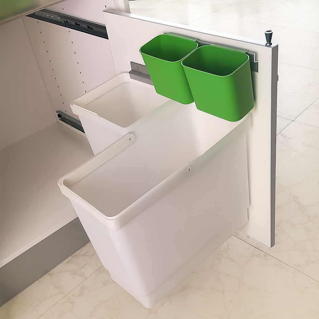 • Fleksibel placering: Monter affaldsspande på både den brede og smalle side – eller lav en L-formet løsning, hvis skabet kræver det.