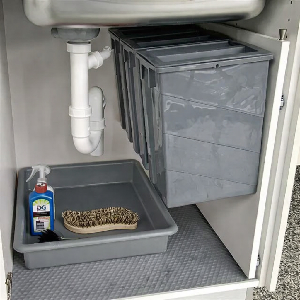 Pladen monteres direkte i skabet og giver dig fuld frihed til at vælge antal spande, størrelser og præcis placering – helt uden at blive begrænset af vandrør, afløb, kabler eller smalle skabe.