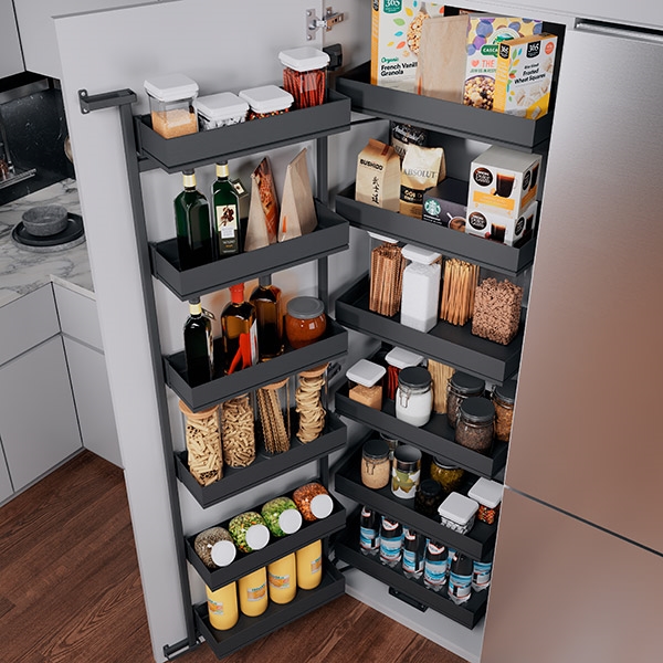 Revolutionerende løsning til højskabet i køkkenet. Når skabet åbnes, sikrer et udtrækssystem, at kurvene automatisk kommer med ud, så der er optimalt overblik og nem adgang til indholdet i skabet. Kan anvendes både ved højre- og venstrehængslede låger.